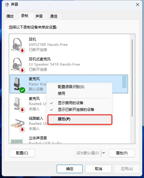 3、Windows下关闭麦克风的独占模式,在此模式下某些应用程序可能会申请独占使用麦克风导致其他应用无法使用麦克风。具体方法为:控制面板→硬件和声音→声音,在录制选项中找到使用的麦克风设备,右键选择属性