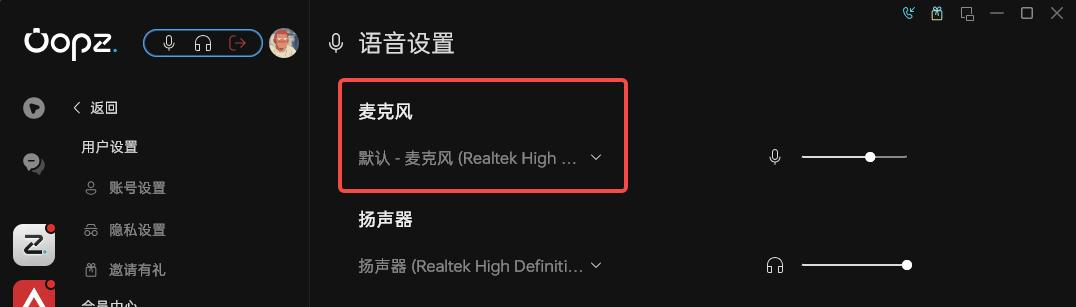 在右键调音台菜单中点击【语音设置】,进入语音设置页,检查麦克风是否选中了正确的设备,如果选中的不是你当前用来采集声音的设备,可以点击展开列表选中正确的设备。