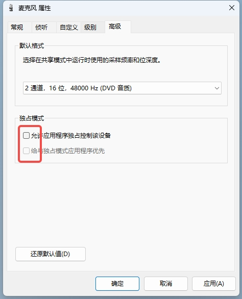 在高级选项中,取消独占模式选项