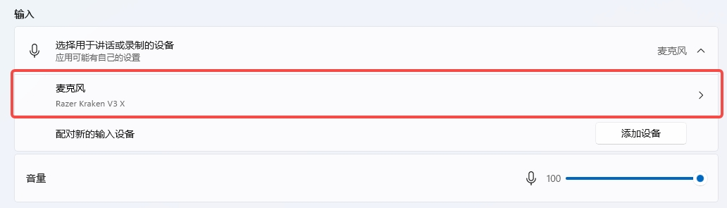 3. 在操作系统检查当前输出设备是否正常。具体方法为:开始→设置→声音,在输入设备中找到使用的耳机设备,点击进入