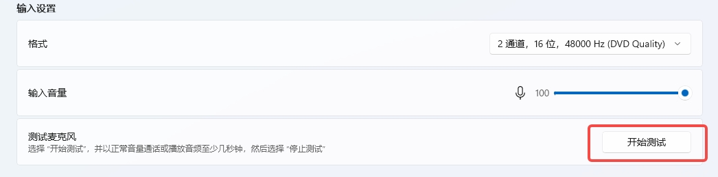 然后点击“开始测试”,即可检查麦克风输入声音是否正常