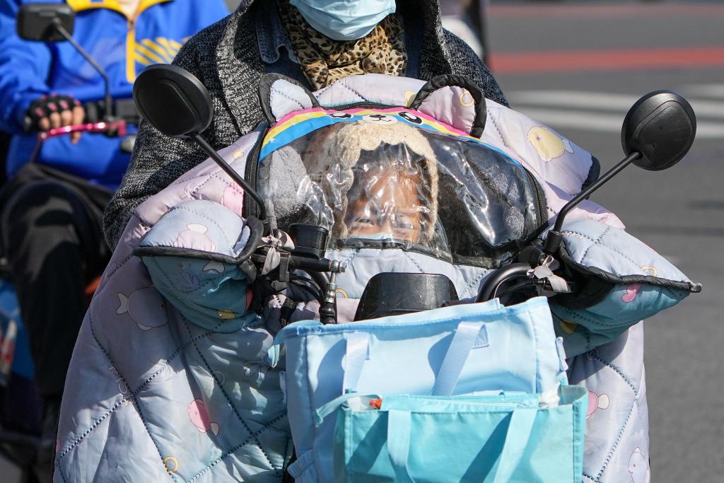 10月18日,一位小朋友在电动自行车的挡风后面躲风。新华社记者 鞠焕宗 摄