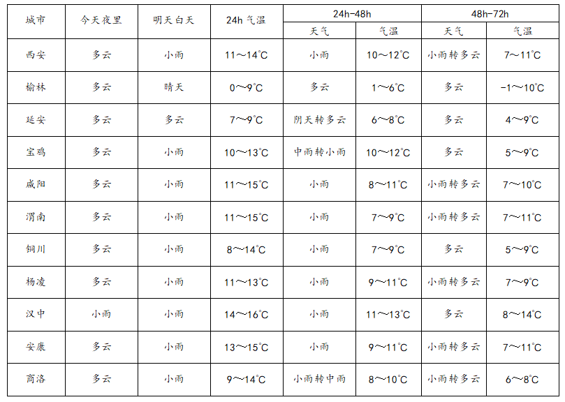 今天晚上:全省阴天间多云,陕北东部局地有小雨或雨夹雪(0.13mm),关中西部局地、陕南西部部分地方有小雨或阵雨(0.15mm)。日平均气温陕北北部下降4℃左右。陕北北部及西部有霜冻。