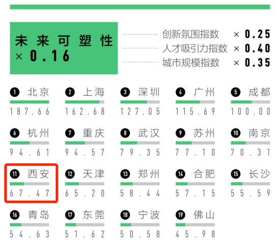 未来可塑性包含创新氛围指数、人才吸引力指数和城市规模指数,强调城市的长期承载力。本次榜单指出,西安等地在科研机构数量上居新一线城市前列,成为重要的创新资源高地。此外,西安等地吸引本省七成以上高校毕业生就业,形成“省内极核”结构。