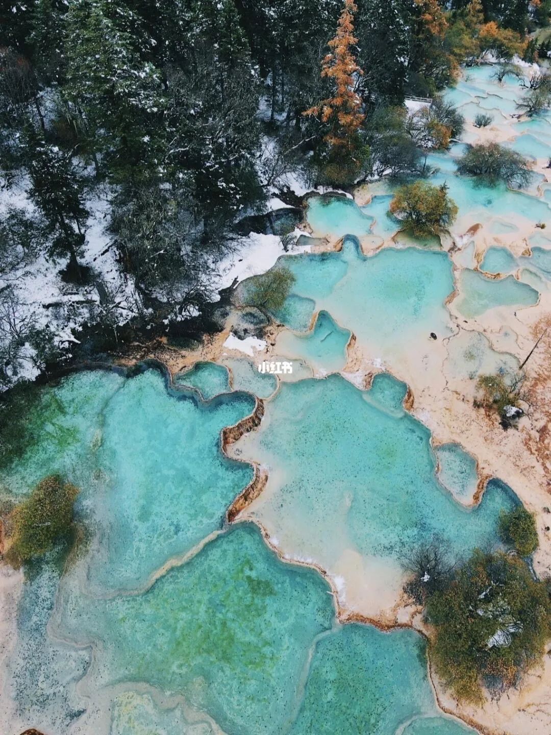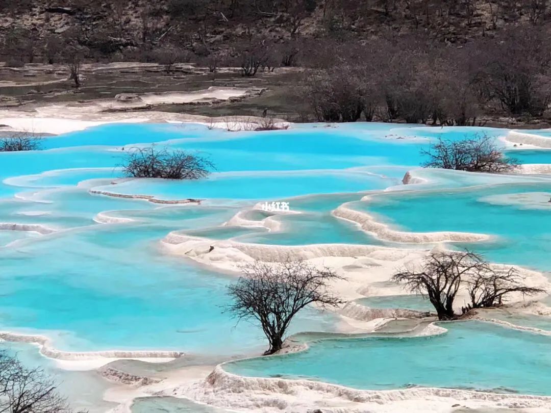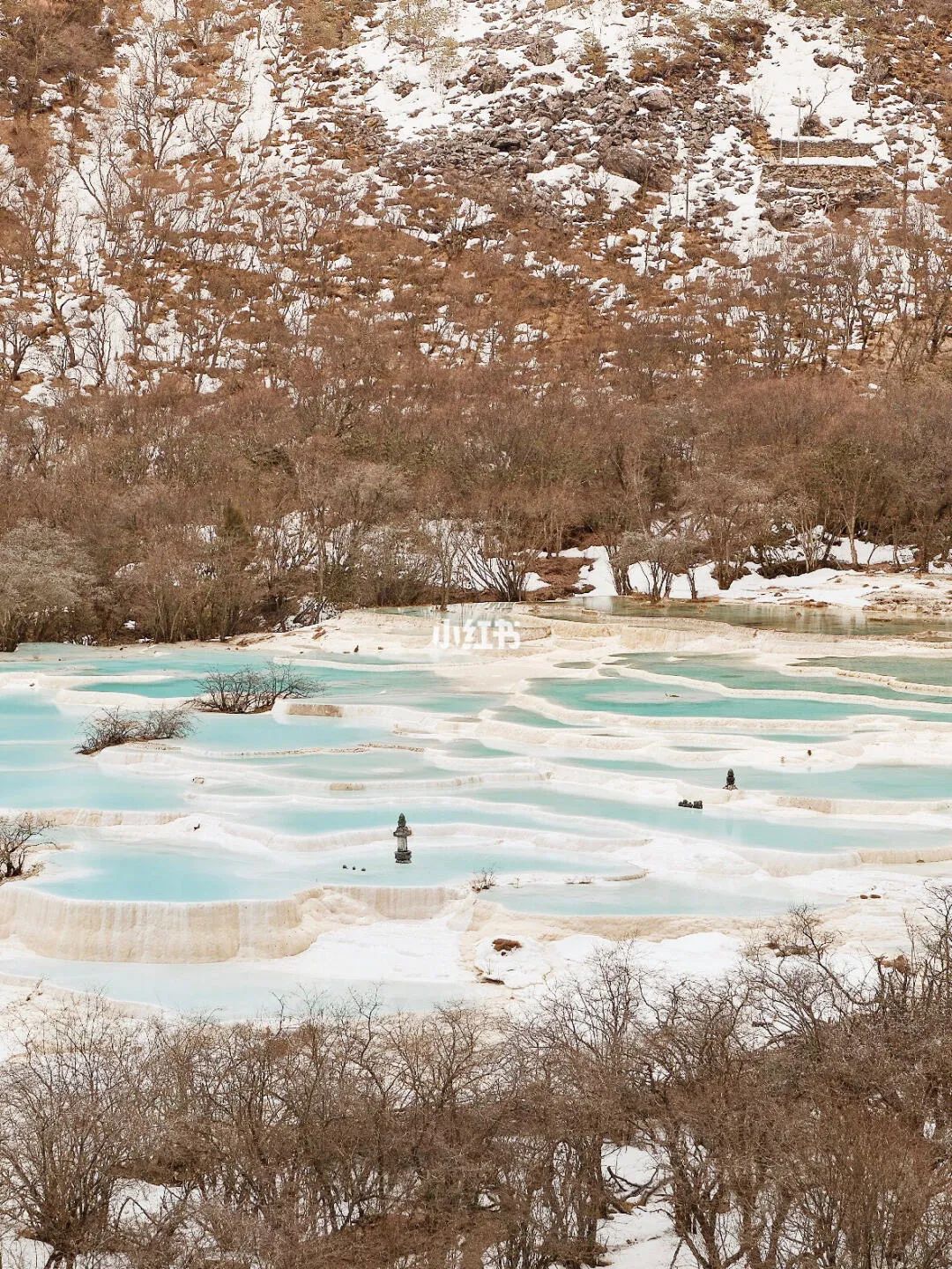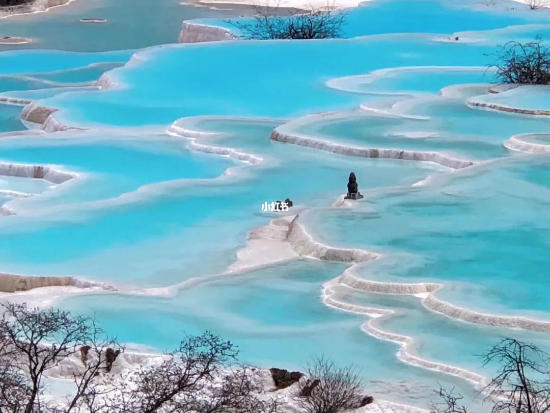 “大部分的钙华池还是干枯状态,但也只冬去春来这个季节,才能看到最高处最精华的五彩池呈现出最纯净最梦幻的Tiffany蓝,简直媲美土耳其棉花堡!”