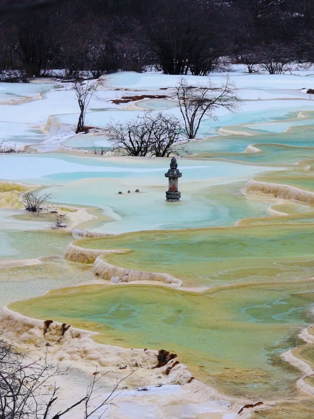 “一直觉得冬天的黄龙是最美的时候,可以看到一路的雾凇,覆盖满雪的雪宝顶,蓬台的冰瀑,色彩斑斓的五彩池。也不用担心人挤人,在高处不胜寒的世界里,每一秒都仿佛置身仙境。”
