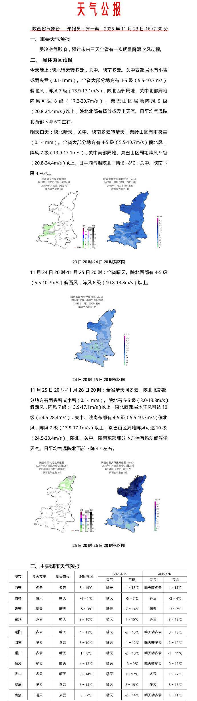 近期西安市以多云到晴天气为主,受多股冷空气影响,今(11月23日)晚起有降温吹风天气,最高气温将下降4~6℃。另外,今晚至明天白天、26日有3—4级西北风,阵风6—7级,同时受上游传输影响,部分地区部分时段将有浮尘天气。