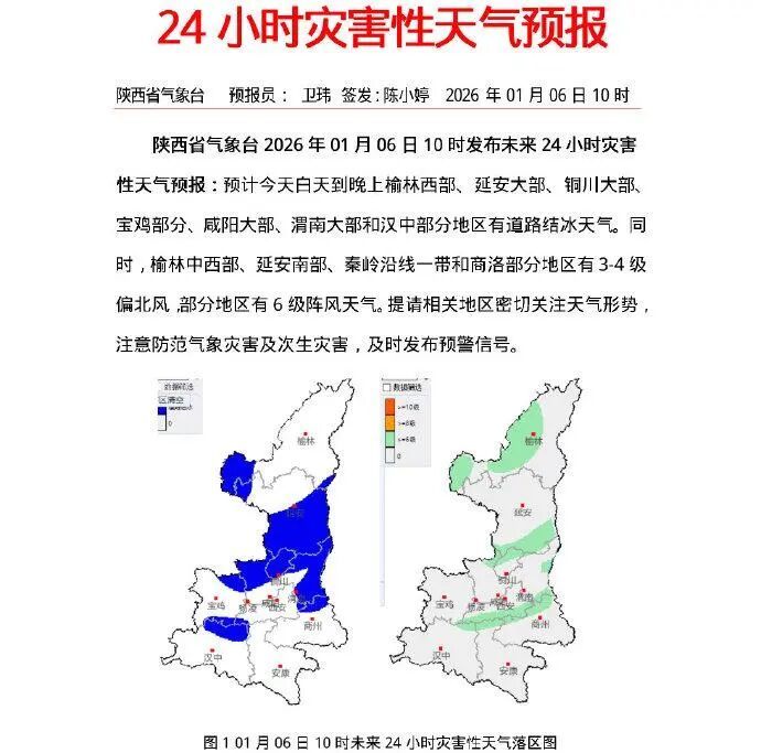预计今天白天到晚上榆林西部、延安大部、铜川大部、宝鸡部分、咸阳大部、渭南大部和汉中部分地区有道路结冰天气。同时,榆林中西部、延安南部、秦岭沿线一带和商洛部分地区有3—4 级偏北风,部分地区有6级阵风天气。提请相关地区密切关注天气形势,注意防范气象灾害及次生灾害,及时发布预警信号。