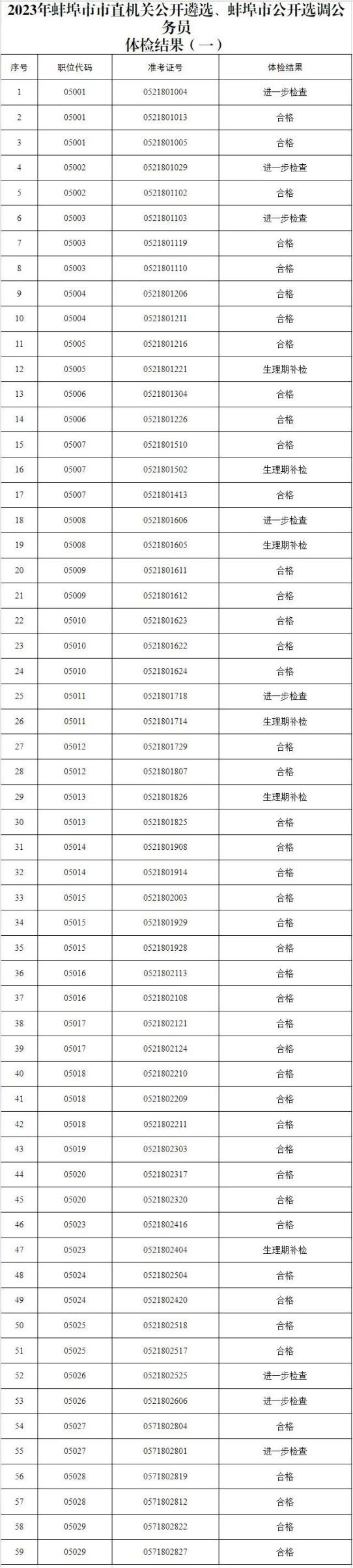 根据2023年蚌埠市市直机关公开遴选、蚌埠市公开选调公务员有关文件规定,现将2023年蚌埠市市直机关公开遴选、蚌埠市公开选调公务员11月4日体检结果进行公布。体检合格的考生进入考察程序,相关事项由考察单位通知。请进一步检查、补检的考生于11月13日上午7:30前在蚌埠市第一人民医院体检中心集合(空腹),并按规定和要求参加体检。请考生保持电话畅通。