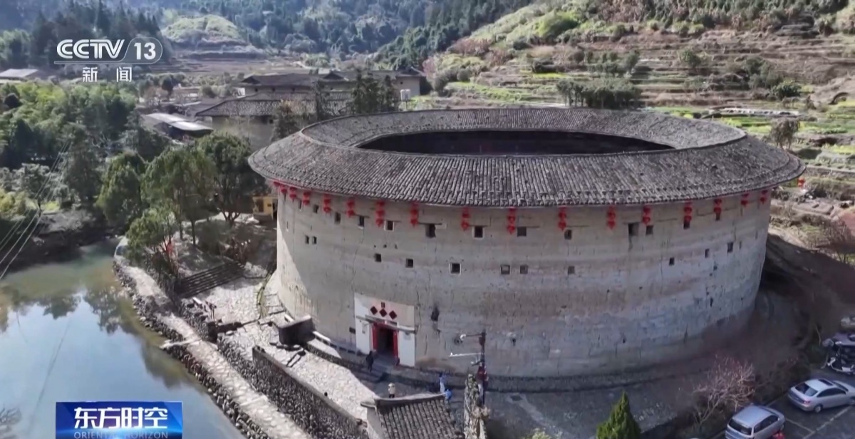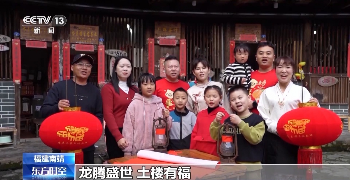 在南靖土楼裕昌楼内,一盏盏象征着喜庆的火红灯笼高高挂起,一幅幅新春对联遍布楼内。