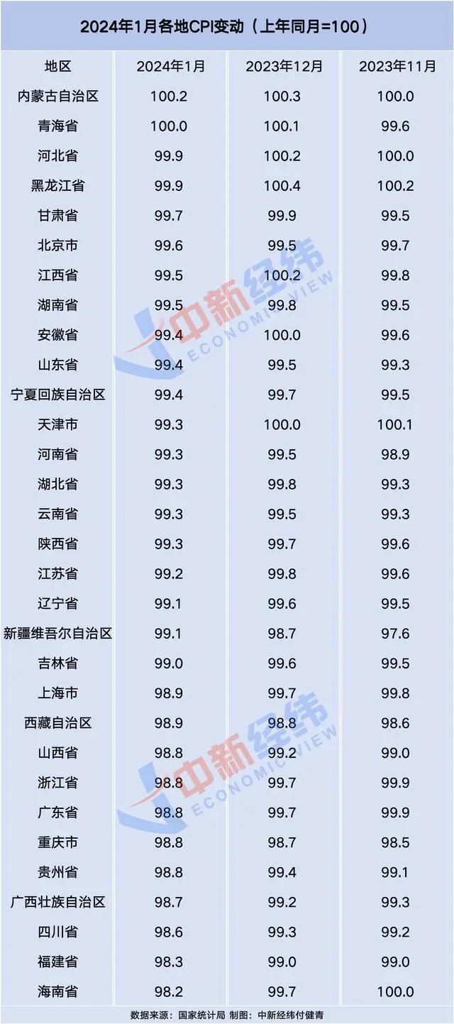 具体来看,内蒙古同比涨0.2%,青海持平;降幅方面,上海、西藏、山西、浙江、广东、重庆、贵州、广西、四川、福建、海南均同比降超1%,贵州、河南、山西等3省份物价已连续十个月回落。