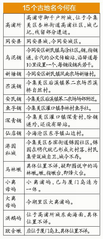 在《泉州府舆地图说》图册中还可以看到“慈济宫”、“白礁巡司”、“文圃山”、“五通渡”、“高崎澚”、“曾家澚”、“厦门所”、“烈屿巡司”、“金门所”等地名。方碧勇介绍,仅《高浦所图说》上就为后人留下了当时15个重要的地名,这些地名大都与厦门有关。他进行了逐一解读。