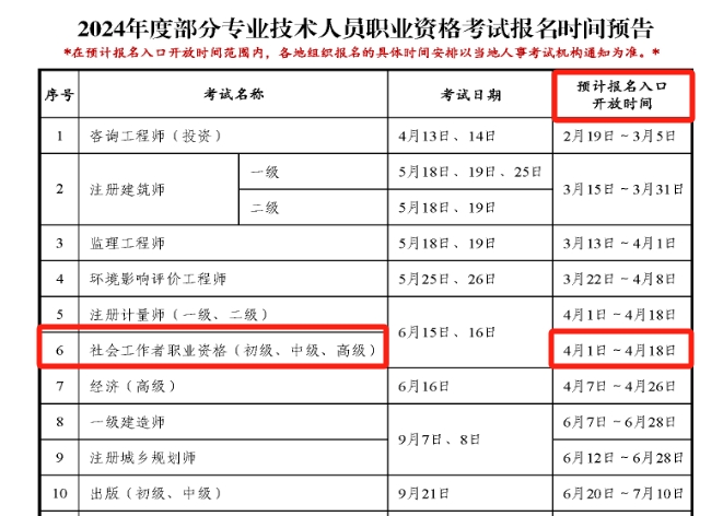 《2024年度专业技术人员职业资格考试重要提示》中涉及2024年社会工作者报名时间信息的截图如下: