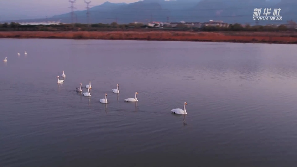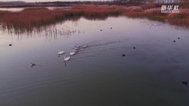 初冬时节,一群天鹅在位于华山脚下的渭河支流长涧河栖息越冬。在落日的映照下,洁白的天鹅或展翅滑翔、或嬉戏觅食,构成了一幅绝美的冬日生态画卷。