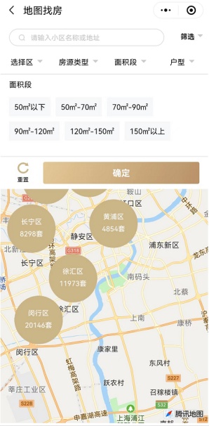 2、支持行政区、街镇、小区的地图筛选,可通过点击圆圈或放大缩小屏幕进行操作,查看相应范围内的房源数量与信息。