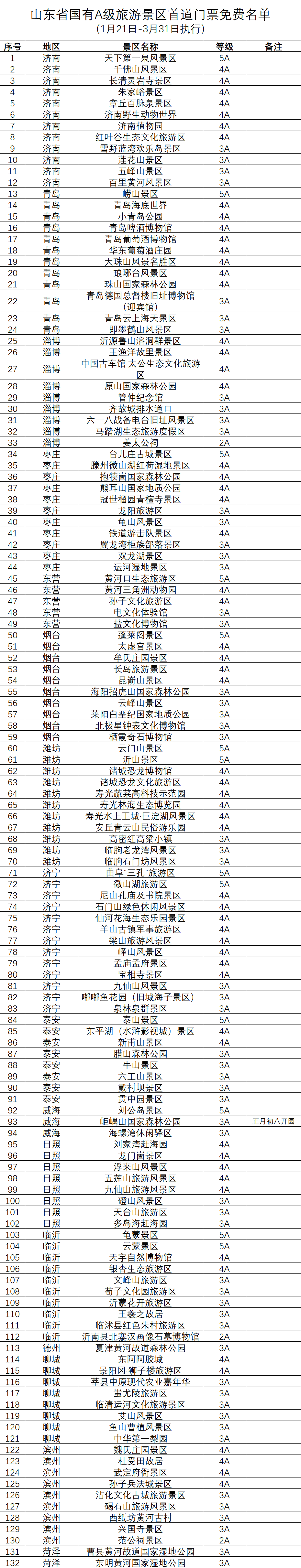 山东省国有A级旅游景区首道门票免费名单(132家)