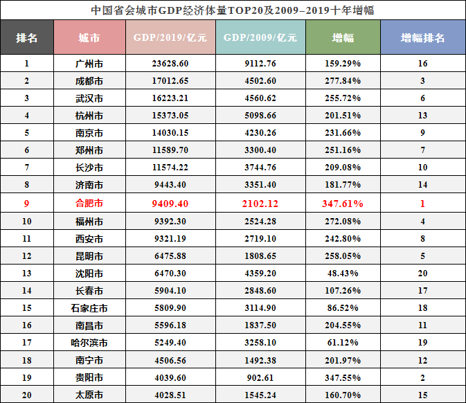 2009年至2019年,10年间合肥一路奔跑,超越自我,更是超越了大多伙伴,经济增幅347.61%,居省会城市第9位超过大连、烟台、南通等22座大中城市,居全国城市第21位与杭州、南京共同跻身新一线城市。