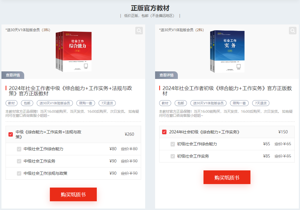 初级社会工作师考试指导教材包含《社会工作综合能力》和《社会工作实务》,中级社会工作师考试指导教材包含《社会工作综合能力》、《社会工作实务》和《社会工作法规与政策》。