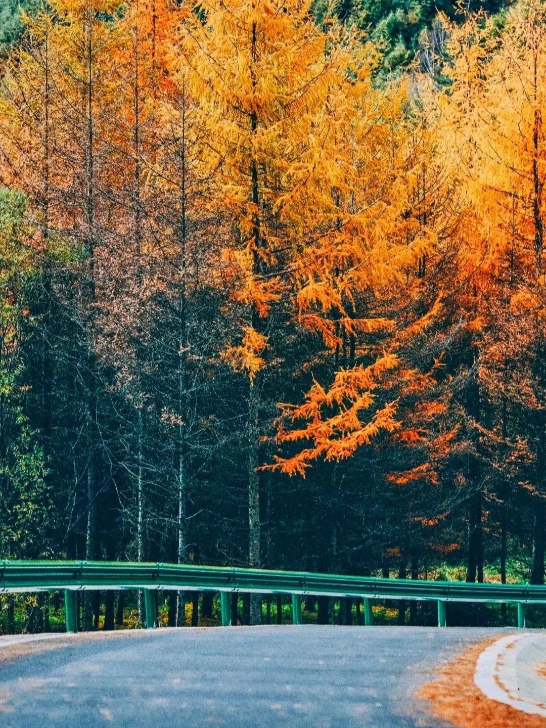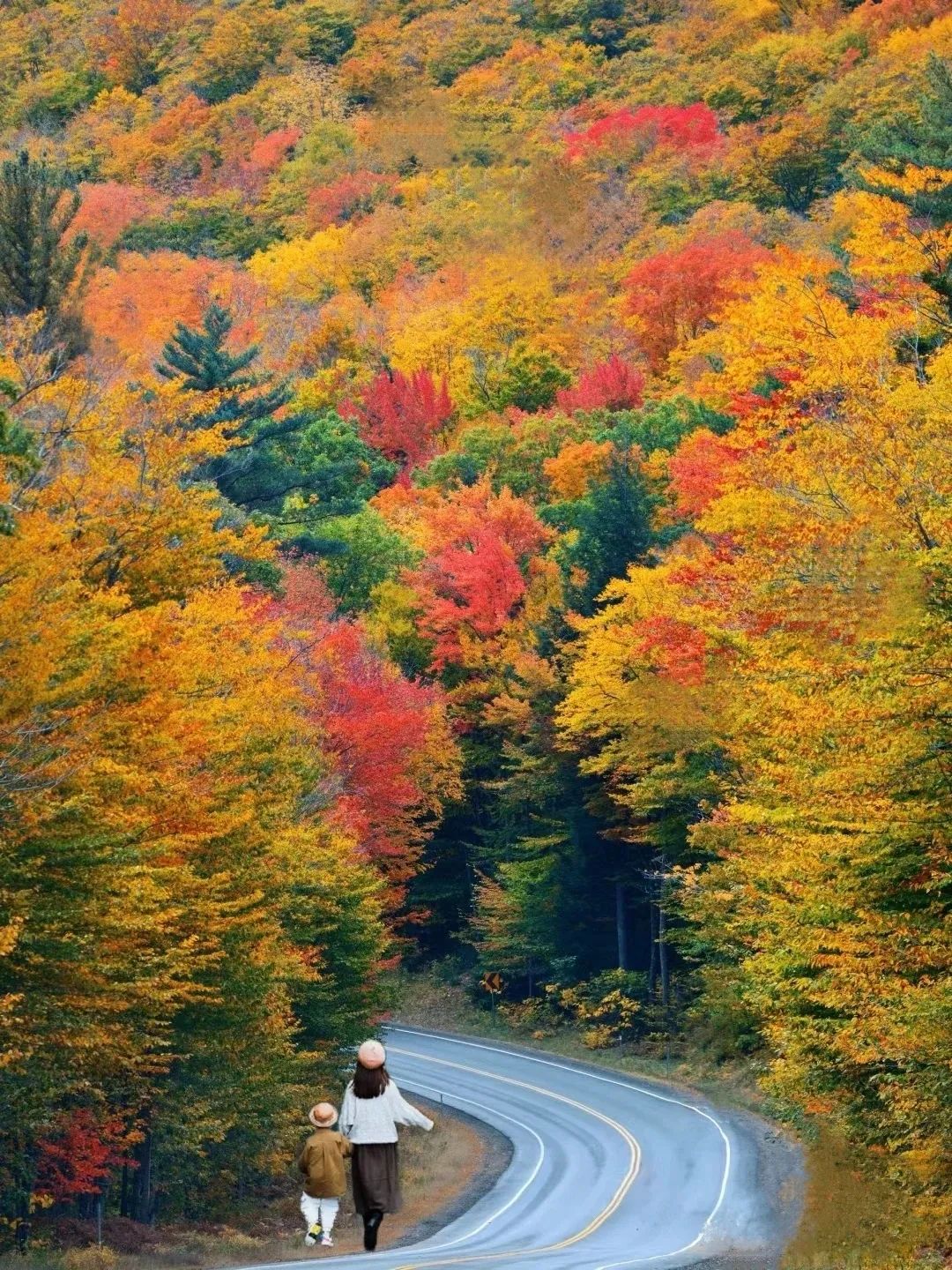 道路两侧的山峦,在秋天里像是被大自然打翻了调色盘。各种树木的叶子交织在一起,红的似火,黄的像金。