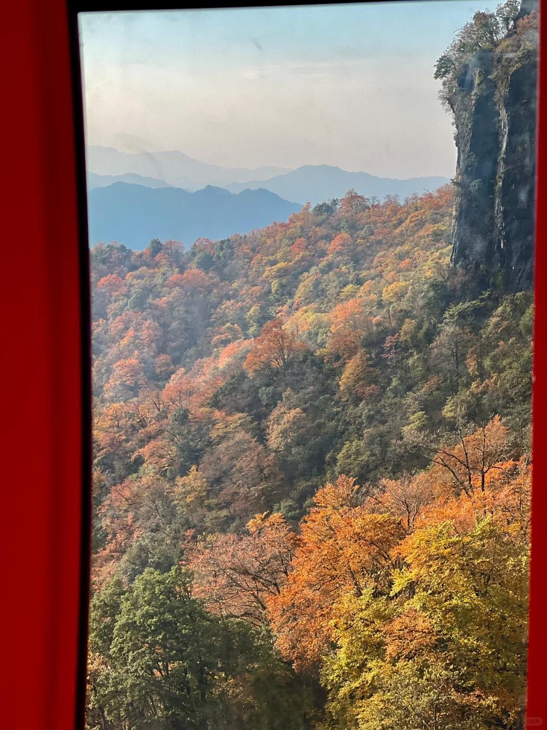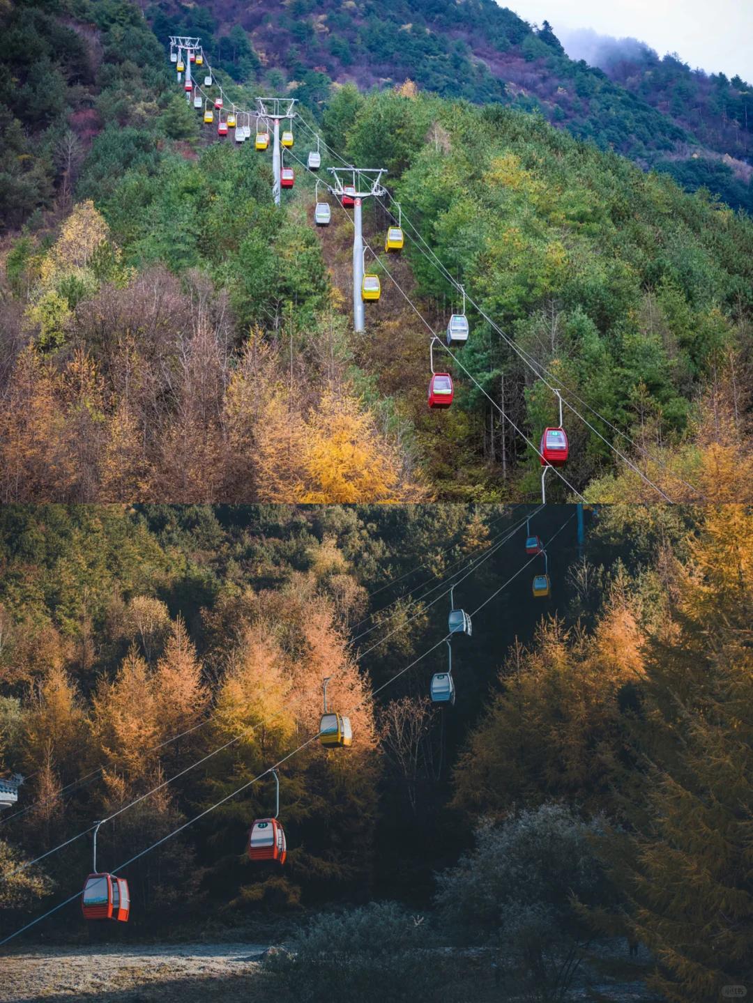 乘坐缆车上山,便可将一片色彩斑斓尽收眼底!漫山遍野的彩林似乎没有尽头似的往前蔓延,宛如一幅浓墨重彩的千里画卷!
