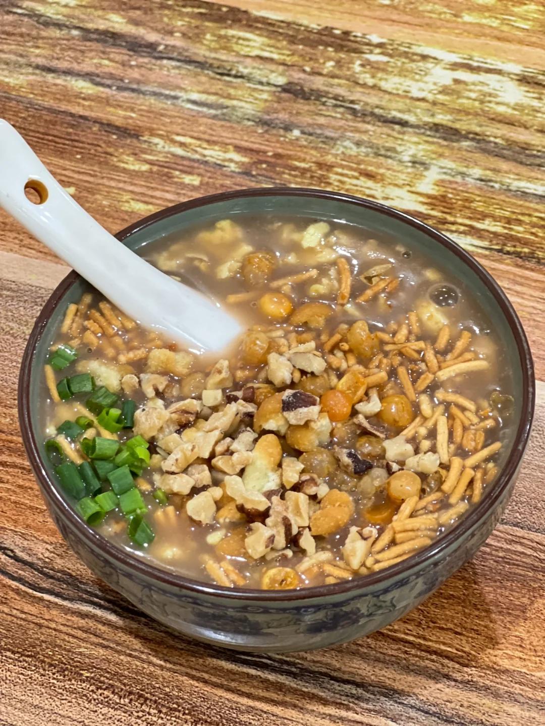 将煎炒的核桃仁,豆腐,鸡蛋,油炸酥食等放在碗中,冲入茶叶,藿香,面粉等熬煮的茶汤,便有了一碗茶香四溢,浓稠黏腻的罐罐茶,还能配上烤黄的馍块吃。