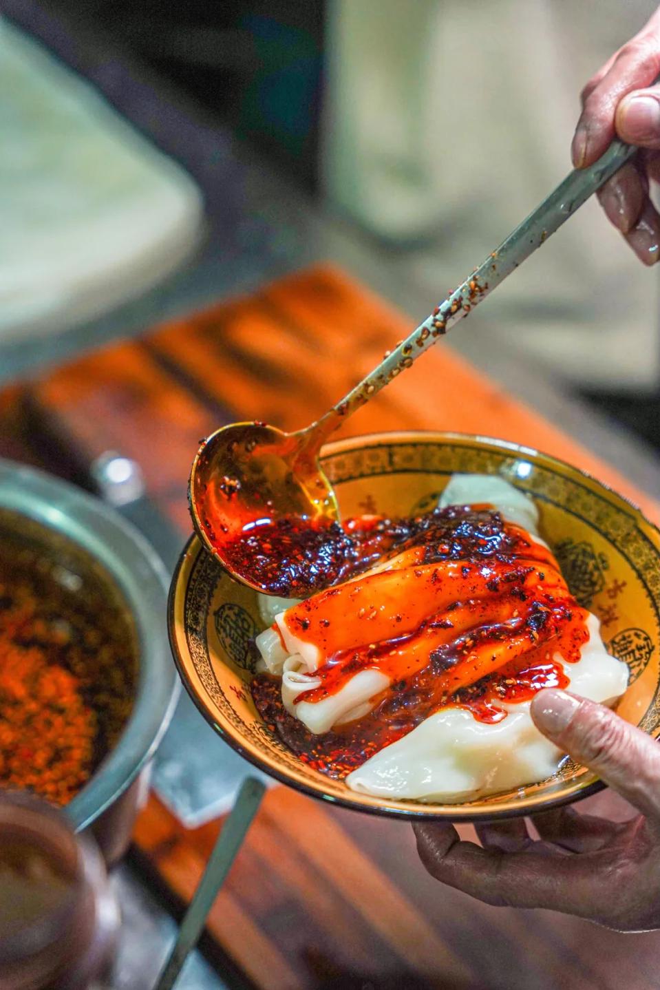 当地人会把蒸好的面皮,置于通风处降温。再抹上菜籽油切成细条状,配上黄豆芽,土豆丝等“垫底儿”,淋上秘制油辣子。