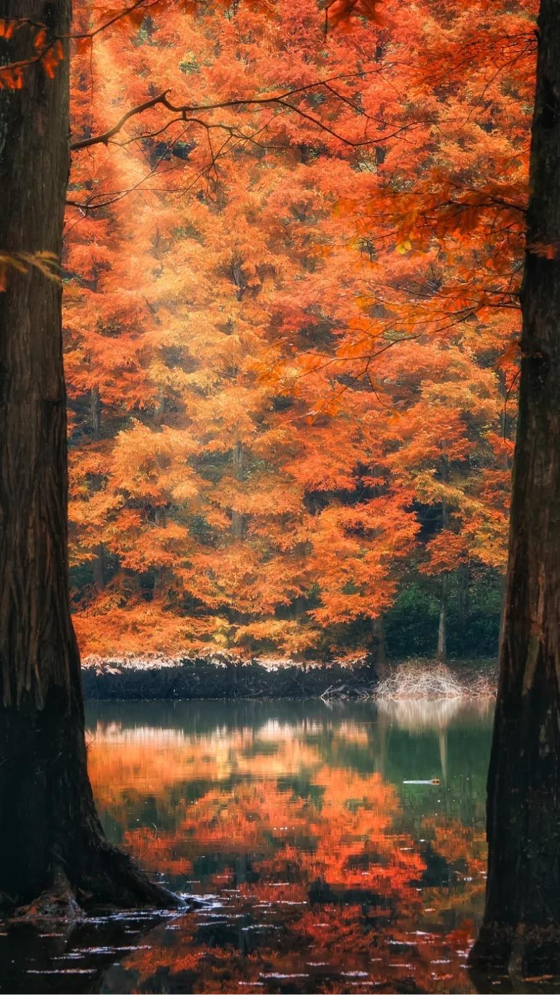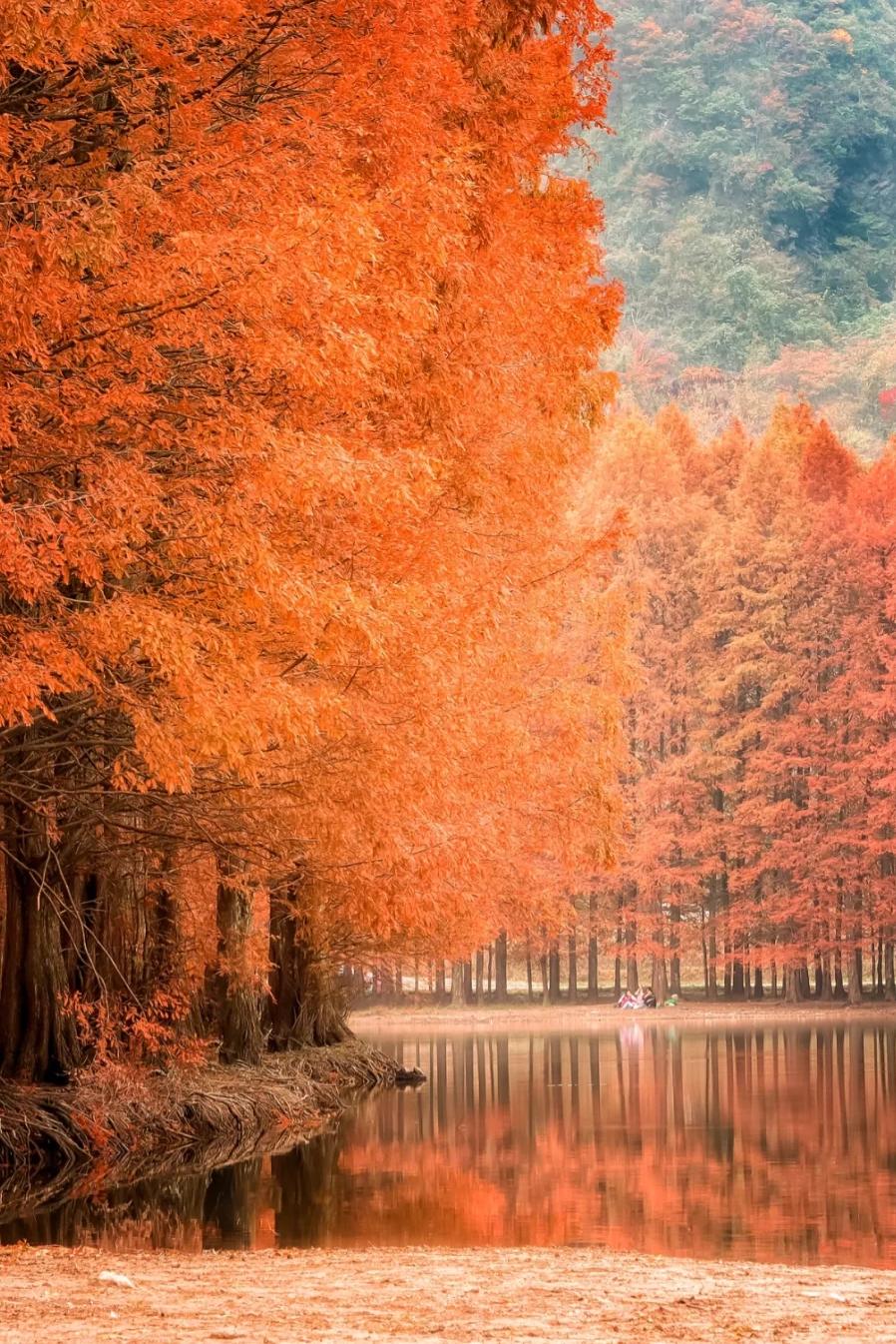 水杉变成红色,倒映在湖水中,与湖面上的蓝天白云相映成趣,构成了一幅色彩斑斓的油画。