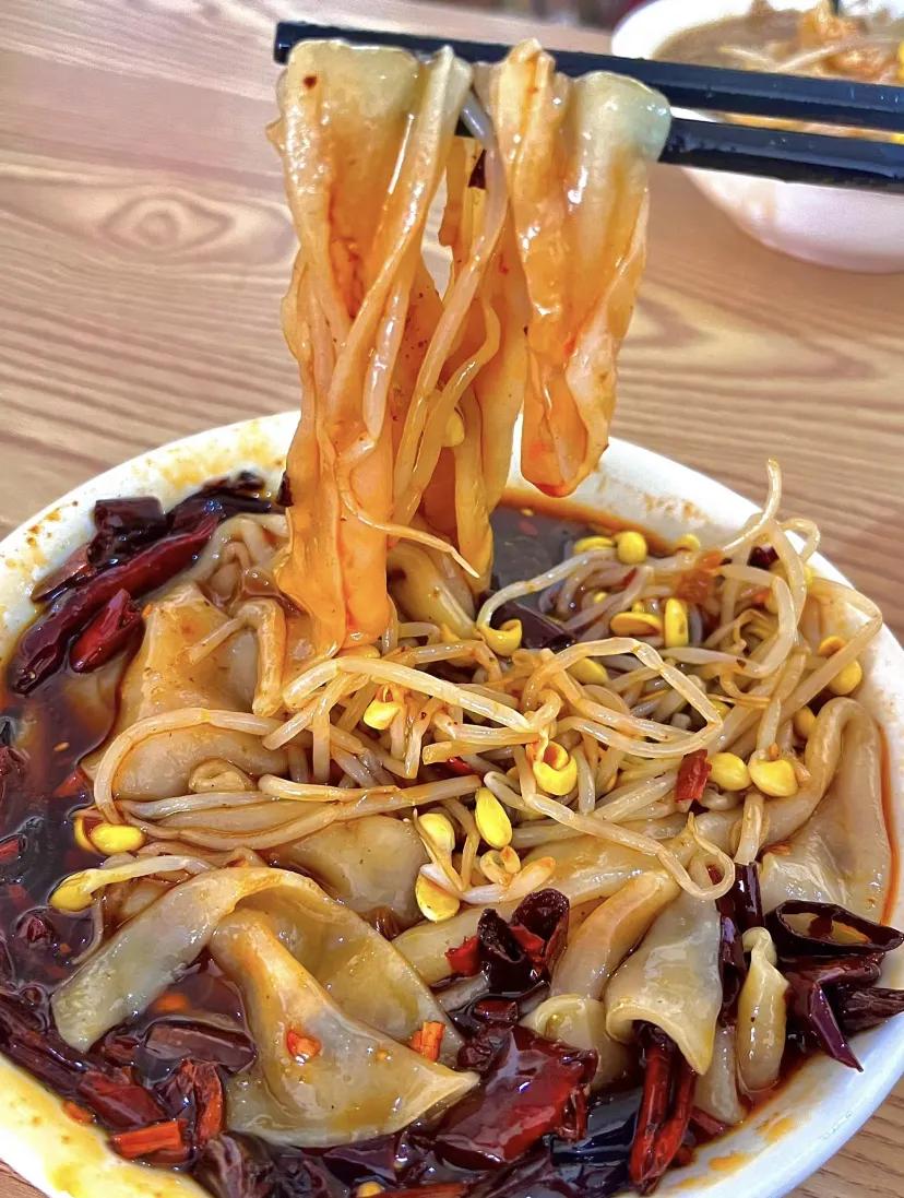 再配些黄豆芽、土豆丝、黄瓜丝,吸溜一口嗦进嘴里,面皮软糯弹韧,配菜爽脆可口,裹挟着红艳艳的辣油,又香又辣又鲜。