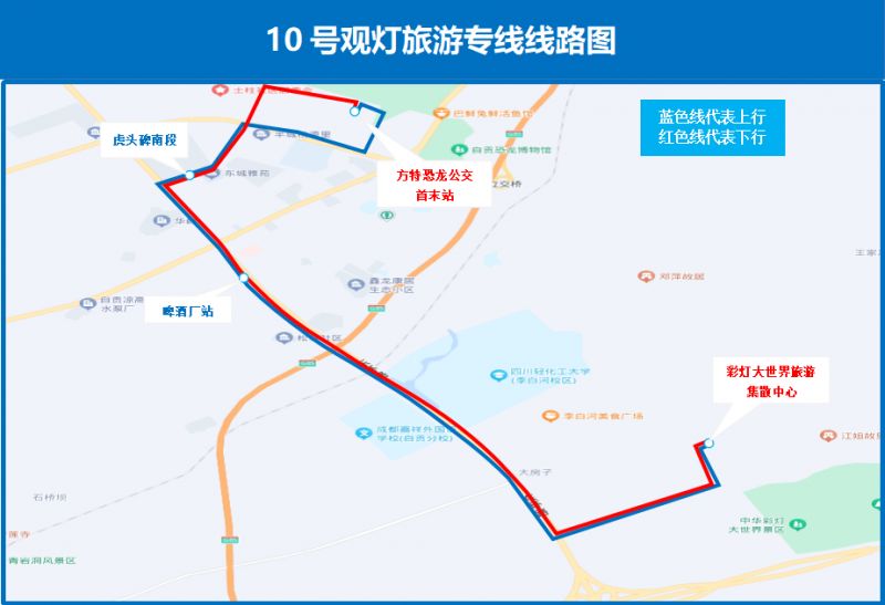 线路走向及停靠站点:高铁公交首末站—彩灯大世界旅游集散中心(一站式到达,中途不停靠)
