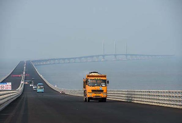 一辆运输沥青的工程车辆行驶在港珠澳大桥桥面上。(图片来源:新华社)