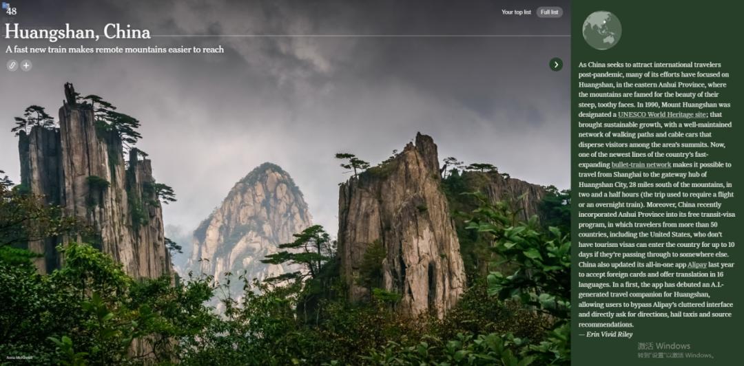 《纽约时报》指出,位于安徽省东部的黄山以陡峭山脉、怪石嶙峋闻名。中国在过去30年急速发展,黄山的旅游步道和缆车网络都有良好维护。加之中国高铁日趋完善,从上海到黄山市仅需2.5小时车程。此外,中国在免签证政策和Alipay(支付宝)的普及化,让海外友人能更方便地游览各景点。