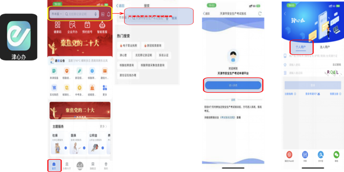 答:您在完成特种作业安全技术培训后,可使用手机下载“津心办”APP(天津市官方政务服务平台)并登陆,在首页上方搜索进入“天津市安全生产考试申请平台”,点击“进入系统”并按页面要求申请报名考试。如下图所示: