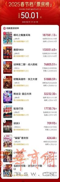 据网络平台最新数据显示,2月1日1时15分,2025春节档总票房(含预售)破50亿!《哪吒之魔童闹海》、《唐探1900》、《封神第二部:战火西岐》分列春节档票房榜前三位。