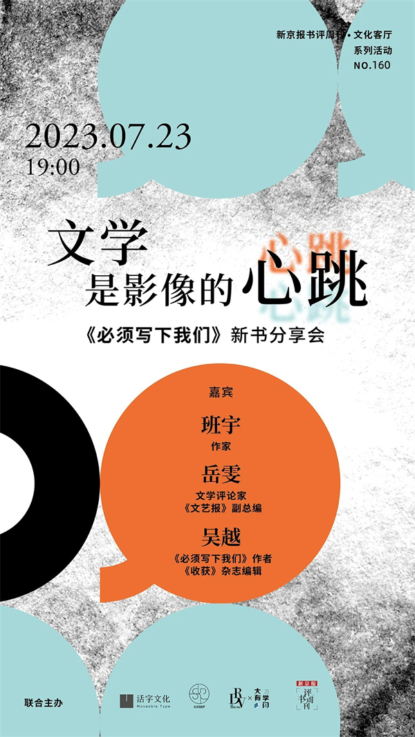 作为文学编辑、媒体人的吴越,遇见过太多文学降临的时刻,她着迷于写作者不为人知的内心世界——写作过程和具体生活,开始记录下一个个被写作改变的“人生”,并最终也成为了一名写作者。7月23日晚,我们联合活字文化邀请《必须写下我们:被写作改变的人生》作者吴越,与作家班宇,文学评论家、《文艺报》副总编岳雯,一起来聊一聊以文学为志业的人生。