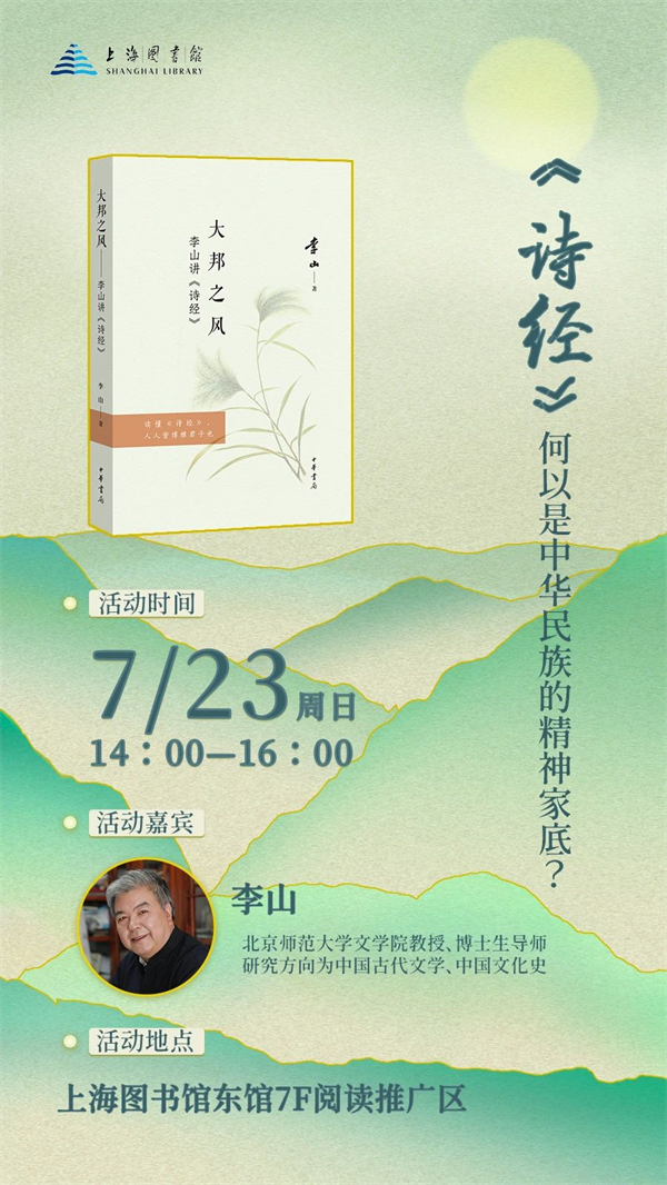 7月23日,北京师范大学教授、博士生导师、《大邦之风——李山讲〈诗经〉》作者李山将来到上海图书馆东馆,为读者带来“《诗经》何以是中华民族的精神家底”的讲座活动,从《诗经》的生成、文学价值、文化内涵、现代意义等多角度回答《诗经》何以是中华民族的精神家底。