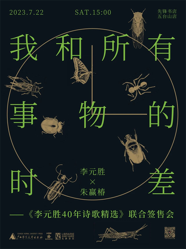 2023年7月,广西师范大学出版社隆重推出新书《我和所有事物的时差——李元胜40年诗歌精选》。诗人是如何淬炼出自己的美学视界与诗学品性的?李元胜说,是旷野中的行走与对昆虫的观察重塑了他的写作,而本书的艺术设计师朱赢椿同样以“虫子诗”作为创作的灵感来源。7月22日,我们邀请了著名诗人李元胜和“最美图书设计诗人”朱赢椿做客南京先锋书店五台山总店,为《我和所有事物的时差》举办联合签售会,并与读者们畅谈诗歌、艺术与自然。