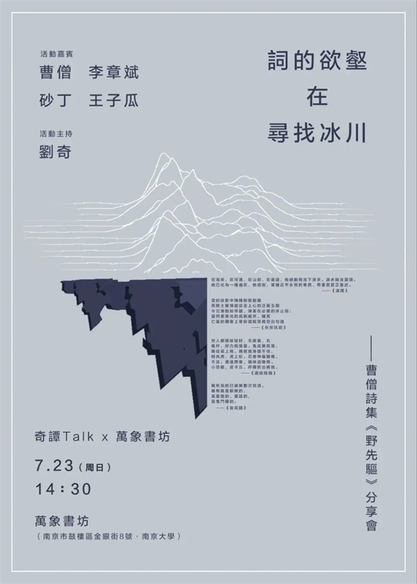 7月23日下午,奇谭Talk邀请诗人曹僧做客,李章斌、砂丁、王子瓜作为对谈嘉宾,刘奇主持,以“词的欲壑在寻找冰川”为主题,举办《 野先驱》诗集分享会,各位嘉宾将会围绕曹僧的诗歌展开交流。