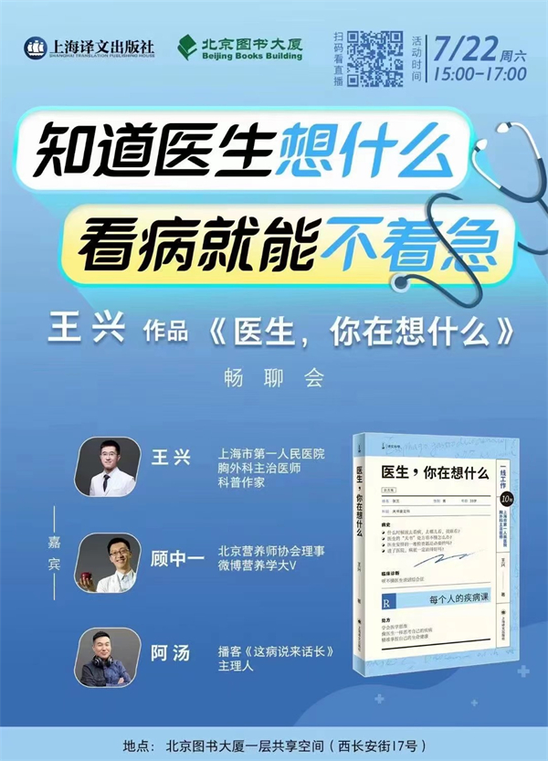 《医生,你在想什么》是医生、科普作家王兴继《病人家属,请来一下》之后最新出版的医疗科普书。结合一线执医多年的经验,王兴从寻医、问诊、治疗各个环节中可能碰到的相关问题出发,用通俗易懂的语言讲述了医生面对这些问题时会怎么想、怎么做,为大家提供一堂“每个人的疾病课”。7月22日,王兴、北京营养师协会理事顾中一、播客《这病说来话长》主理人阿汤将一起做客北京图书大厦,跟大家一起聊聊“医生在想什么”。