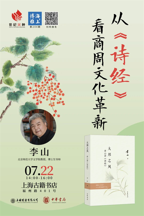 商周文化革新是中国历史上具有划时代意义的大事件,对后世影响深远的宗法制度即是此次革新的产物。《诗经》是文学经典,也是文化经典,蕴含了商周易代背景下文化革新的密码。这部典籍不仅开创了中国文学之路,也因记录了一个非凡时代而意蕴丰厚。7月22日,北京师范大学文学院教授、博士生导师李山将携著作《大邦之风——李山讲〈诗经〉》做客上海古籍书店,并通过主题讲座,带领读者回到商周时期,一同回顾《诗经》里所潜藏的文化革新往事。