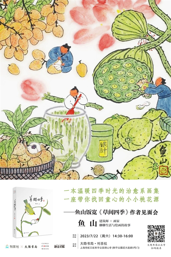2022年,在不便出游的日子里,鱼山构思了以时光为主题的新书《草间四季》,首度以草间世界呈现物候变化、四季流转。除了两百余幅妙趣盎然的四季水墨画,这本治愈系的画集还收录了鱼山关于创作和时光的感悟随笔。7月22日, 大隐书局·刊茶社邀大家在“鱼山饭宽《草间四季》作者见面会”上,与鱼山老师一同在四季轮转间思考生活感悟,在这炎热的夏季,于一方草间体味人生清凉。
