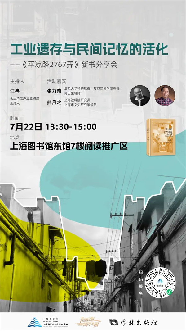 平凉路2767弄,坐落于上海东北角,杨浦区定海路街道,坊间称作“下只角”。1921年,日商公大第一纱厂在此创建。1922年,其配套职员和工人宿舍竣工,定名“公大南北工房”。抗战胜利次年,公大纱厂改为中国纺织建设公司上海第十九纺织厂。新中国成立后,1950年7月1日上海第十九纺织厂更名为国营上海第十九棉纺织厂,社区随之更名为上棉十九厂工房。2021年是平凉路2767弄竣工的第100年,当年9月,复旦大学新闻学院教授张力奋带着12位本科生、2位助教走进这里。一门新的课程——“都市、田野调查与记录”开始了。平凉路2767弄就是他们的“田野”。两年后《平凉路2767弄》由学林出版社正式出版发行。新书出版发行之际,7月22日下午,我们邀请张力奋教授做客上海图书馆东馆,他将和好友上海史知名学者、上海社会科学院熊月之教授一起聊聊这本书的研究背景、田野调查及写作过程。