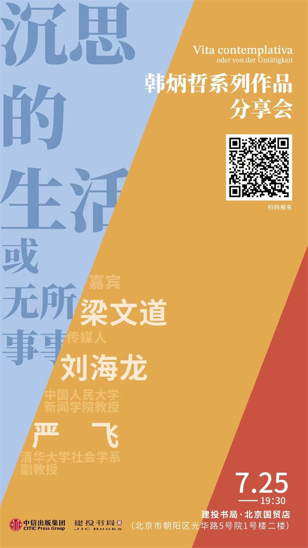 在韩炳哲一系列作品里,他试图从哲学角度来解读现代性社会下的种种迷思。他谈到功绩社会下人们倦怠感的增多,目标感的缺失,身陷嘈杂信息而逐渐失去判断能力等等一系列现象的背后是什么在影响,我们是否有办法去尝试改变自身的处境。7月25日晚,中信出版集团联合建投书局邀请传媒人梁文道、中国人民大学新闻学院教授刘海龙和清华大学社会学系副教授严飞,从韩炳哲的系列作品开始,聊聊在行动至上的绩效社会里,我们如何能够找到属于自己的宁静沉思。