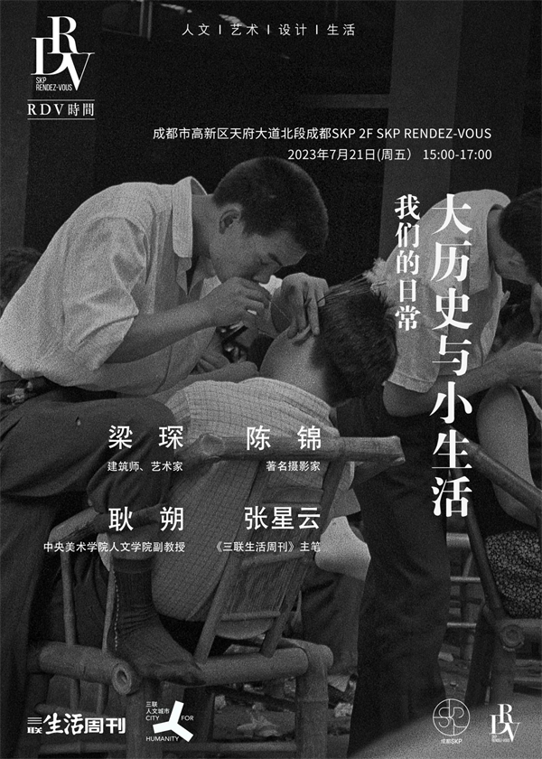 摄影家陈锦用30多年时间记录成都,完成文献式作品《茶铺》《市井》。他拍下了成都茶馆里懒洋洋的茶客,也拍下了这座城市的个性。7月21日下午,我们与《三联生活周刊》联合举办名为“大历史与小生活:我们的日常”主题沙龙,特邀著名摄影家陈锦, 中央美术学院人文学院副教授耿朔,建筑师、艺术家梁琛,《三联生活周刊》主笔张星云,做客SKP。四位对谈者将从成都的日常出发,探讨成都巷陌里的城市性格,以及我们日常小生活里的大历史脉络。