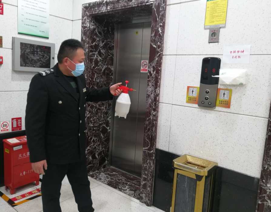 图为乐清市烟草专卖局(公司)工作人员对大楼电梯进行每天多轮消毒