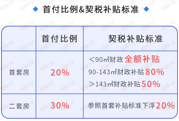 首套房契税补贴标准:<90㎡财政全额补贴;90-143㎡财政补贴80%;>143㎡财政补贴50%;二套房契税参照首套补贴标准下浮20%;