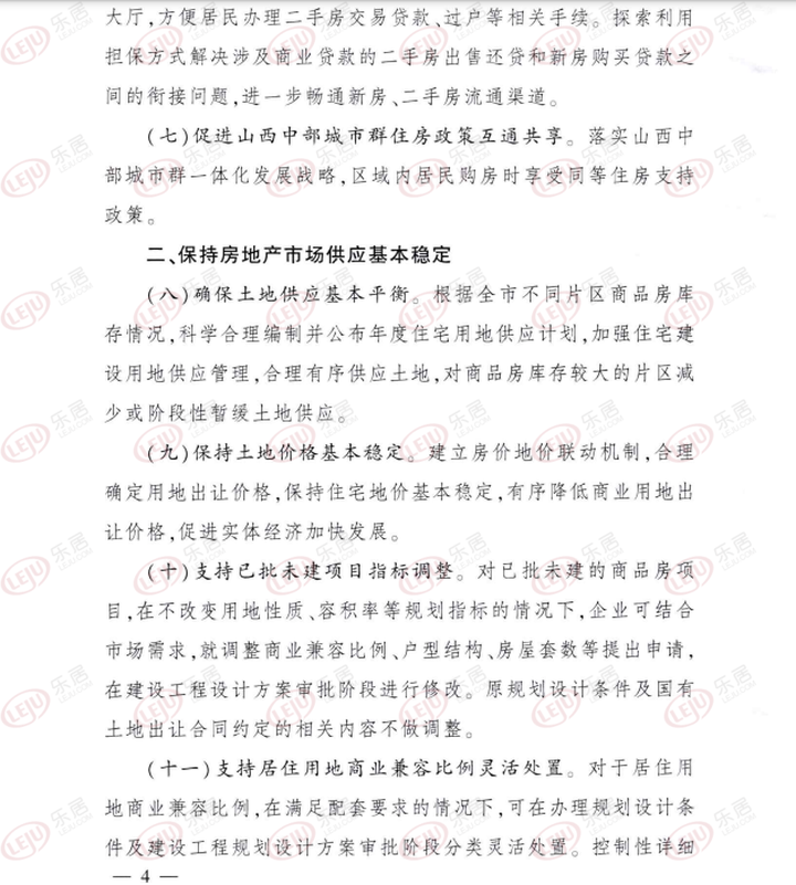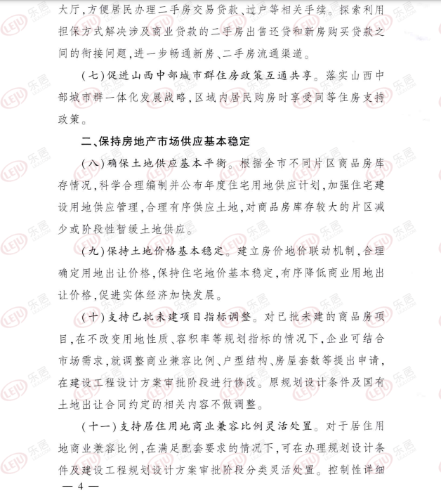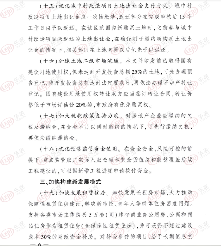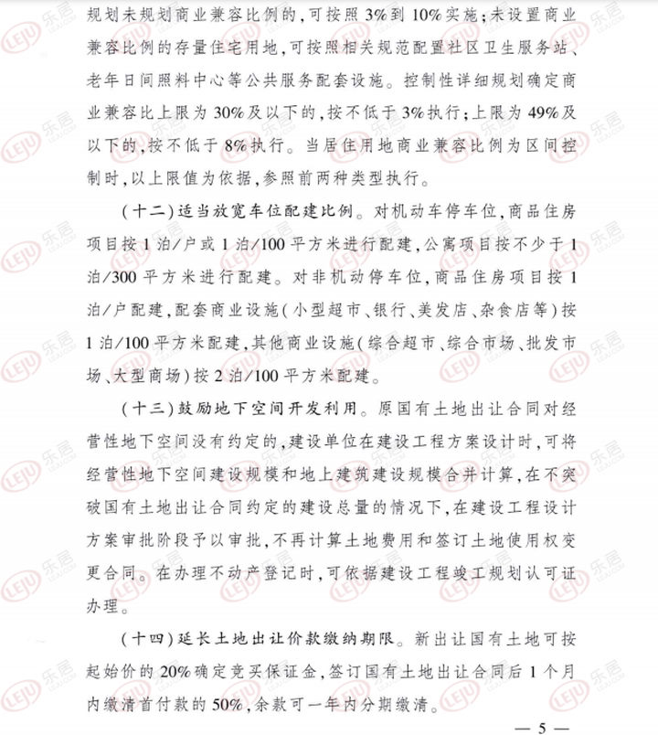 适当放宽车位配建比例;鼓励地下空间开发利用;优化城中村改造项目土地出让金支付方式;加速土地二级市场流通;加大税收政策支持力度;优化预售监管资金使用。延长土地出让价款缴纳期限——新出让国有土地可按起始价的20%确定竞买保证金,签订合同后1个月内缴纳首付款的50%,余款一年内分期缴清。