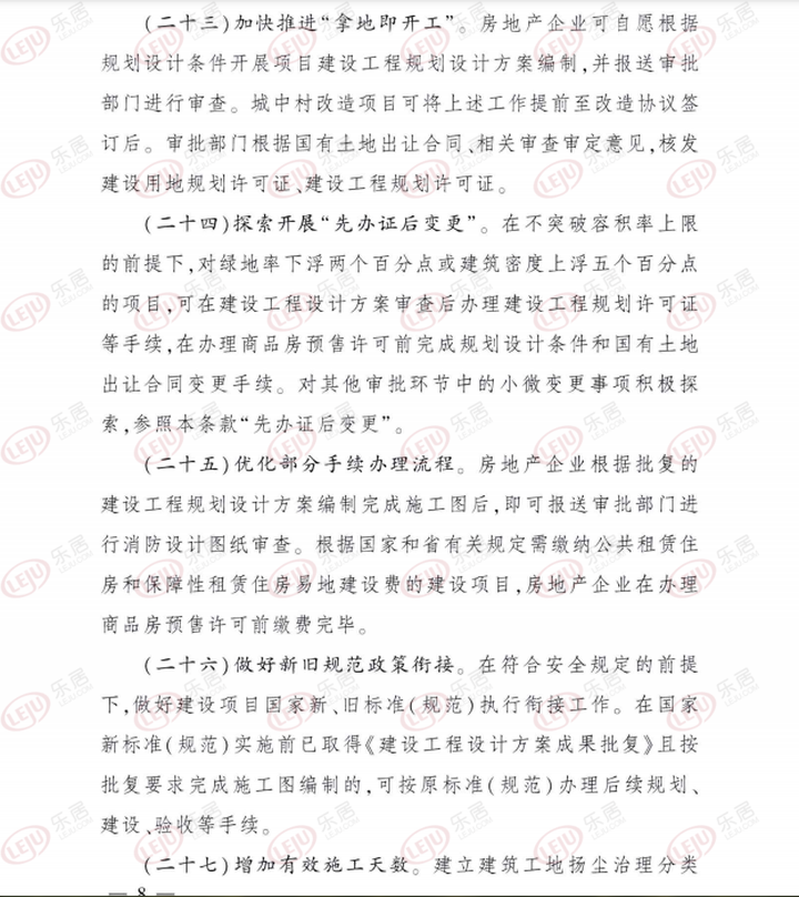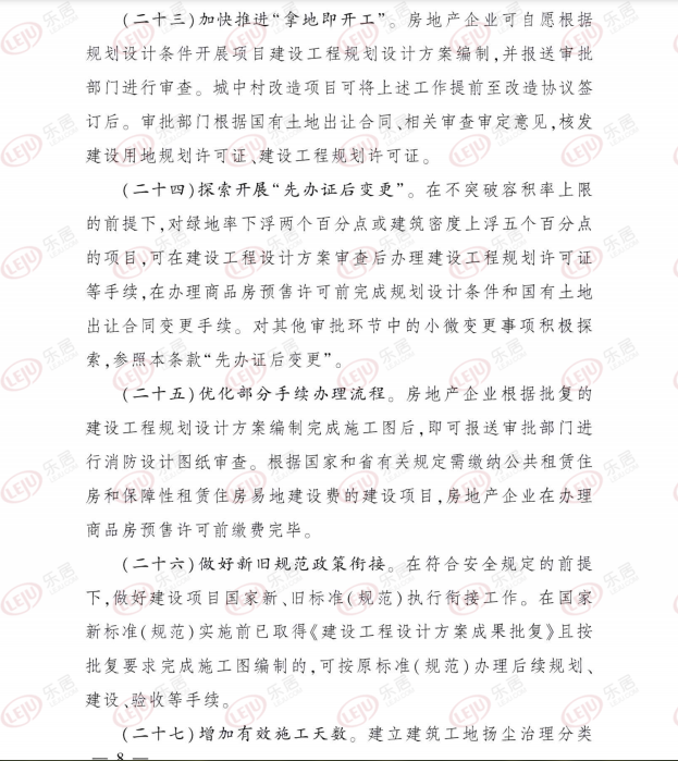 全面推广“房证同交”;加快推进“拿地即开工”;探索开展“先办证后变更”;优化部分手续办理流程; 做好新旧规范政策衔接;增加有效施工天数;开展房地产项目包联帮扶。