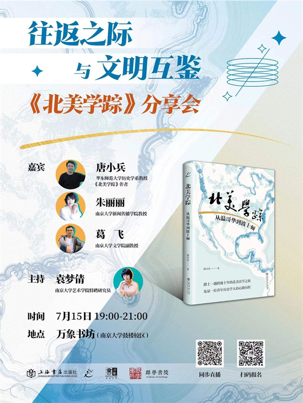 从博士生到哈佛燕京访问学者,唐小兵在《北美学踪:从温哥华到波士顿》一书中,记录下了他在加拿大不列颠哥伦比亚大学(UBC)与哈佛大学的遐思见闻。穿梭于北美高校之间,唐小兵以细致的观察、独到的眼光和思辨的话语,留下了自己或深或浅的踪迹。7月15日,我们邀请到唐小兵老师和南京大学的袁梦倩、朱丽丽、葛飞老师展开对谈,从这一趟跨越十年的访学之旅出发,共同探讨北美学术文化的特征与东西方文明互鉴的经验,在两个世界的来回中,感受不同学术文化之间的碰撞与交融。