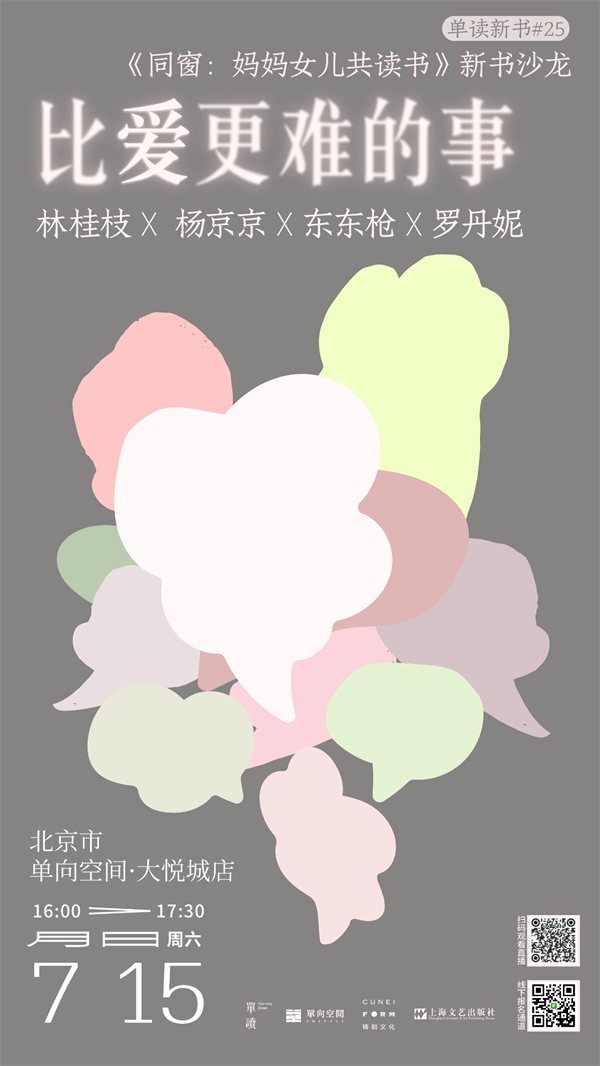7月15日,我们邀请了《同窗:妈妈女儿共读书》的作者林桂枝与杨京京,以及作家东东枪、编辑罗丹妮一起,聊聊“比爱更难的事”——如何与亲密的人进行平等自由的交流?如何通过阅读建立美好的情感,成就美好的关系?