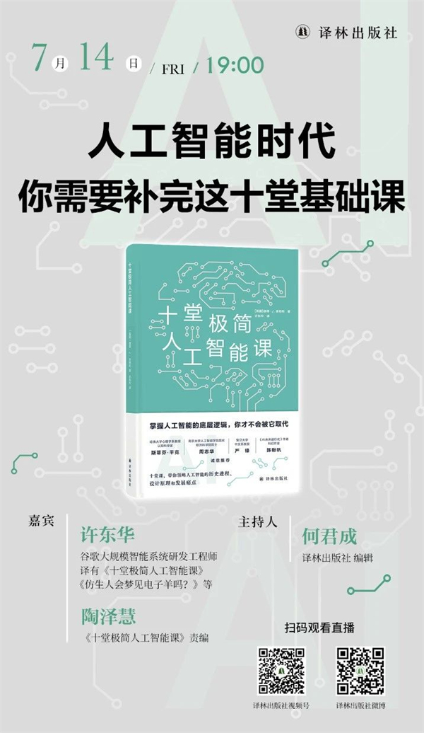 如今,我们既离不开人工智能,也无法摆脱它对我们生活的影响。那么,这门技术到底是如何发展起来的?它会让我们的生活变得更好,还是会带来更多的问题?我们应该如何应对它带来的变革与挑战呢?掌握人工智能的底层逻辑,你才不会被它取代。7月14日晚,谷歌大规模智能系统研发工程师、《十堂极简人工智能课》译者许东华,本书责编陶泽慧,将带你探索人工智能背后鲜为人知的世界。